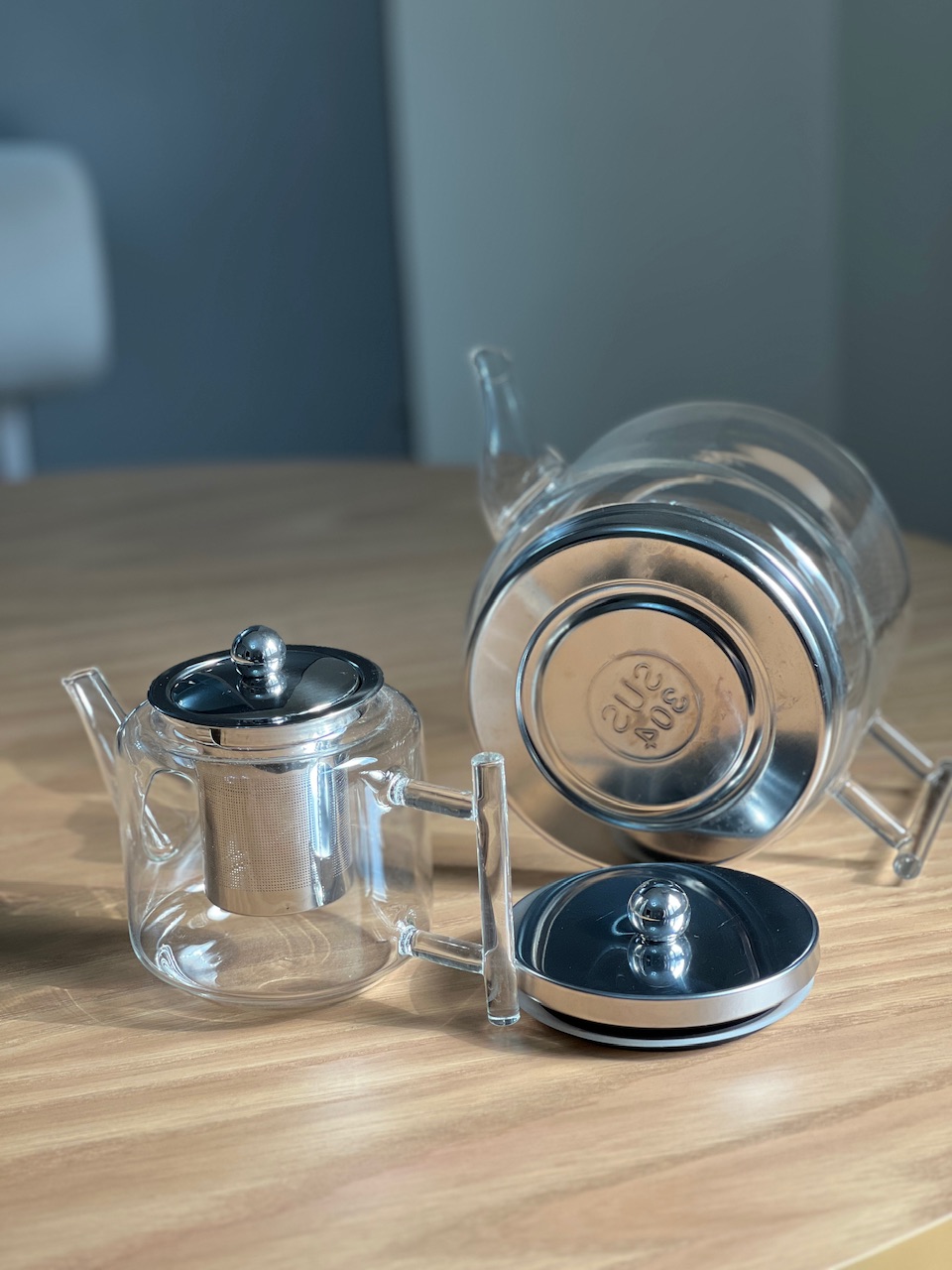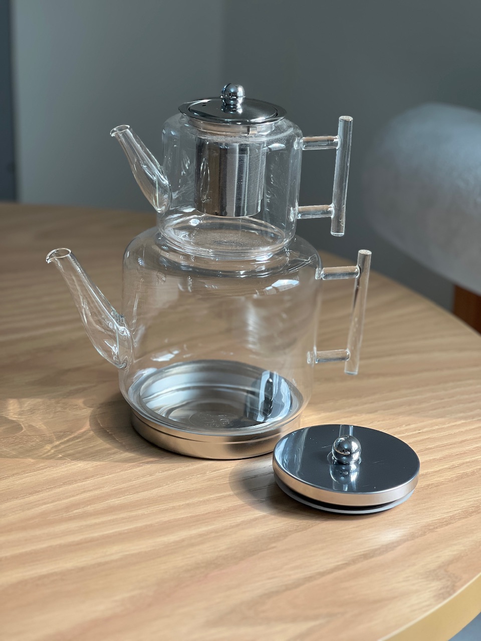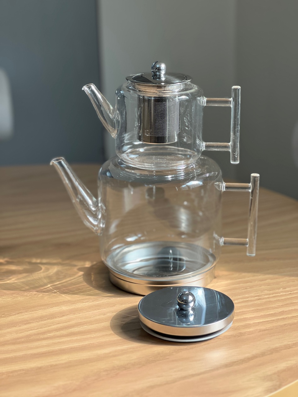 درب کتری و درب قوری از جنس استیل میباشد کف کتری لایه ای از استیل میباشد کتری و قوری از جنس پیرکس و شعله مستقیم میباشد